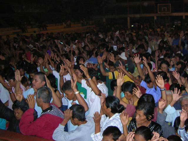 Thousands at the crusade receive Jesus Christ.